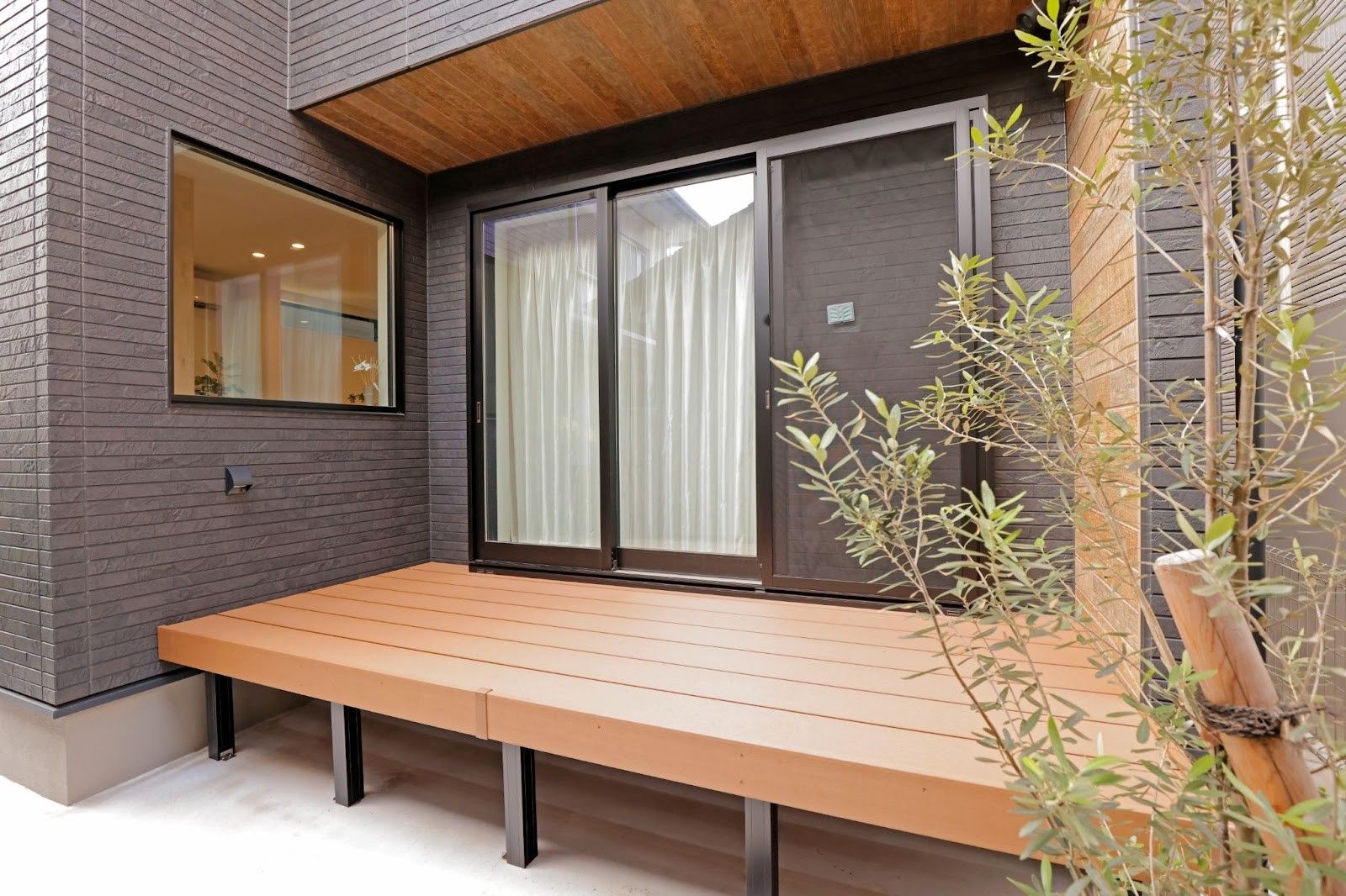 一方、テラスとは、1階の床と同じ高さで庭に向けて張り出したスペースなので、地上に設置されています。住宅ではウッドデッキやタイル、コンクリートを用いてつくるのが一般的です。