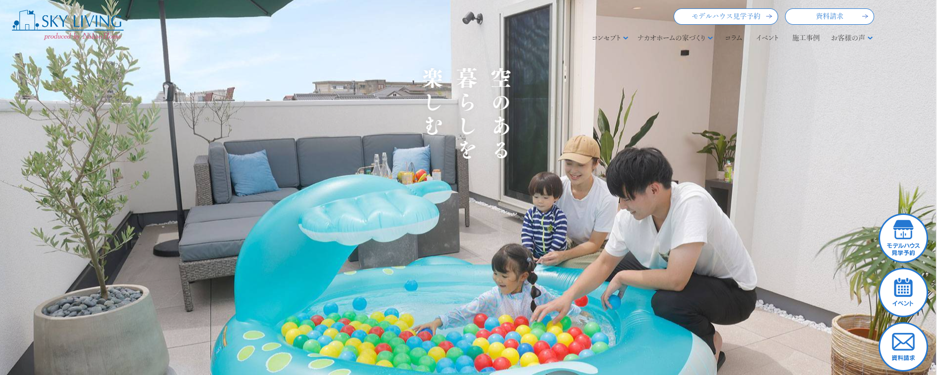 最近は屋上のある家も人気になってきて様々なハウスメーカーも取り入れるようになってきました。ですが、実績のないハウスメーカーに頼むと後でトラブルになる危険も伴います。過去10年間で400棟の実績があるナカオホームのブランド商品【スカイリビング】であればその心配はありません。一度その安心を体感しに来てください。