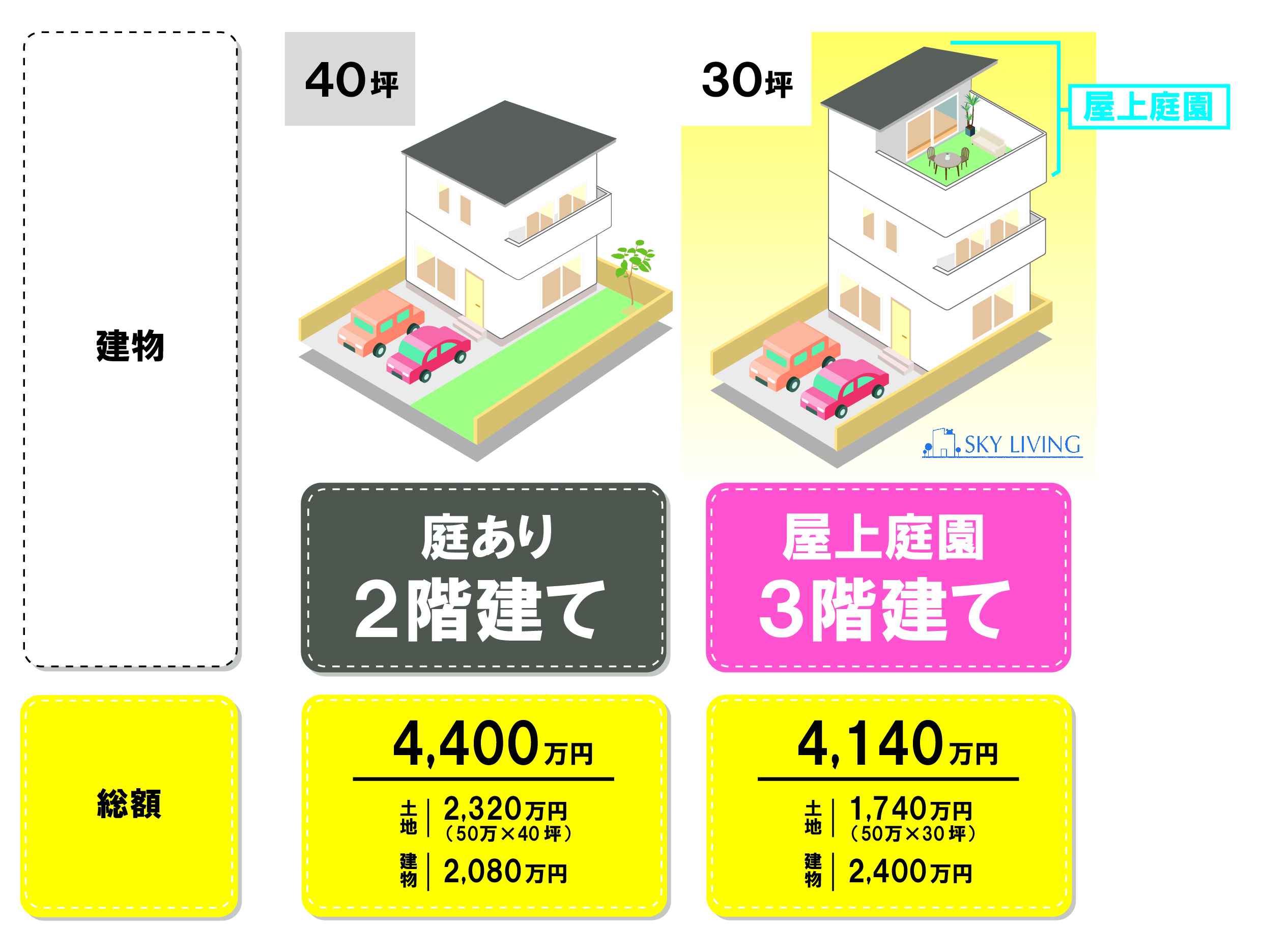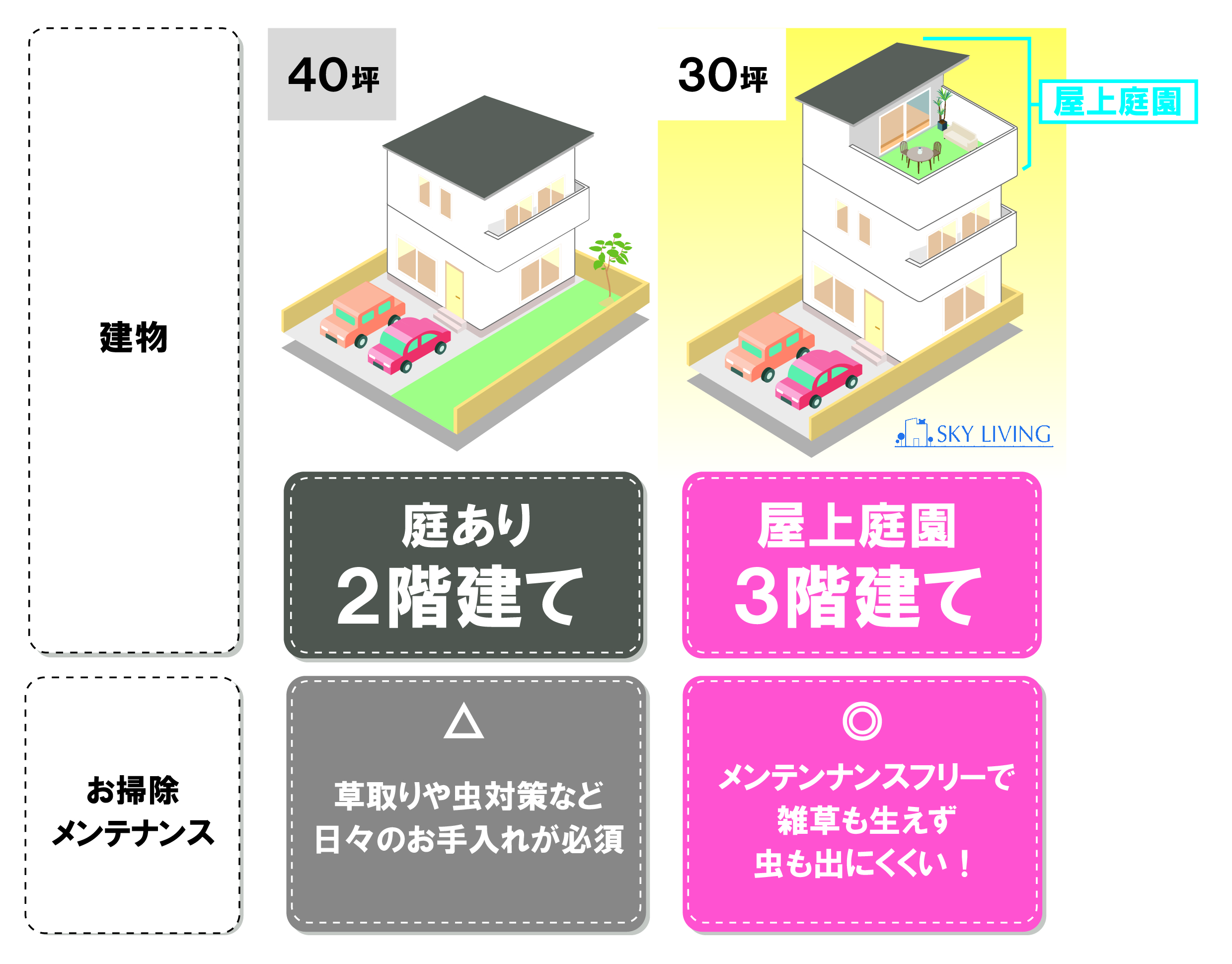 まずは価格です。屋上に庭を設けることは、外に庭を設けることよりもコストを抑えることができます。最近の土地価格は、以前と比べると激しく高騰しています。だからこそ土地価格は抑えたい・抑えるべきなんです。それでも「庭が欲しい」という方はたくさんいます。しかし庭を設ければ土地が大きくなり、価格が高くなってしまいます。そこで屋上に庭を設けることで、土地の大きさと価格を抑えることができます。だからこそ「屋上庭園」の計画がピッタリなんです!
