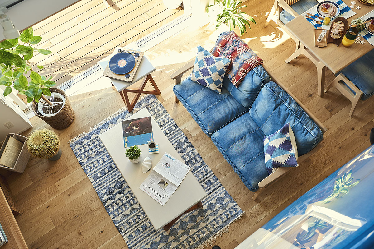 床材もいろいろな種類があります。無垢材、フローリング、クッションフロア、フロアタイル、畳です。一般の住宅のリビングでよく使われるのは無垢材かフローリングです。無垢材だと自然な木目が美しいのがいいですよね。フローリングだとお手入れもしやすいですし、様々な色や模様があってインテリアの幅が広がります。
