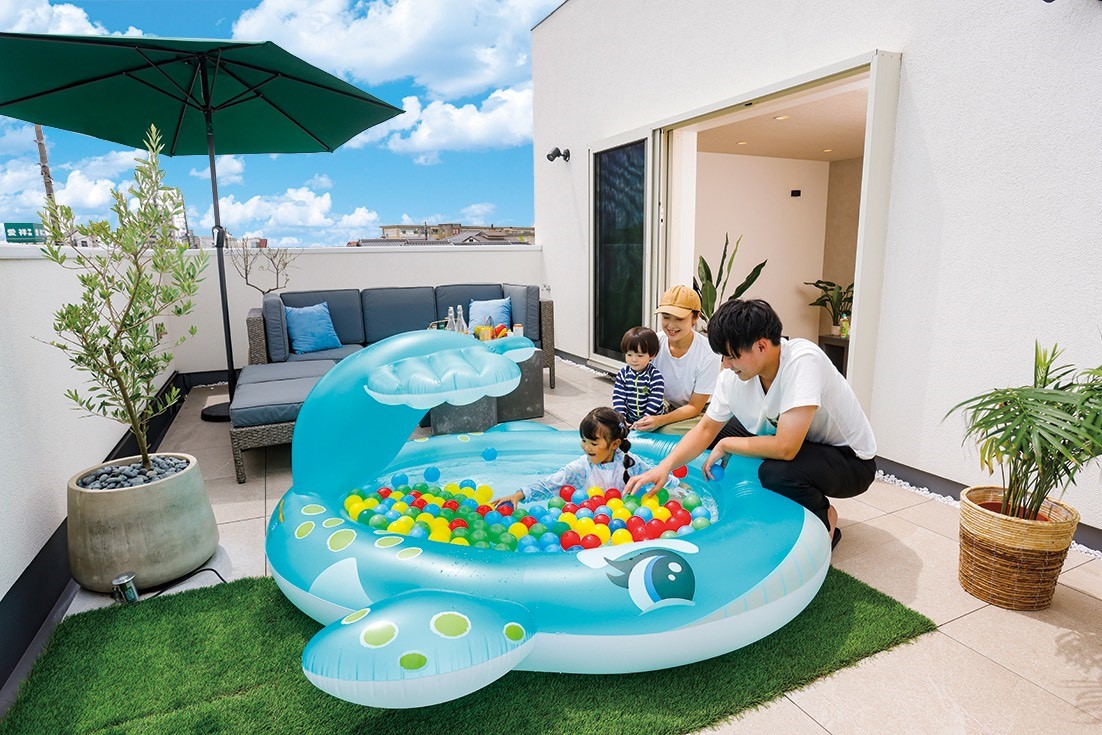 夏の暑い日には、屋上に小型プールや水遊びスペースを設けるのもおすすめです。都会の喧騒から離れた自宅の屋上で、プールサイドでゆったりとくつろぐ時間は、家族全員にとって至福のひととき。子供たちは安全に水遊びができるよう、浅めの設計と滑りにくい床材、フェンスなどの安全対策を徹底。特に、共働きで忙しいママにとっては、プールでリフレッシュすることで日々の疲れを癒すことができるのも魅力のひとつです。プール周りのデザインには、プライベート感を大切にしつつ、隣接するスペースとの家事導線も考慮し、使いやすさと安全性の両立を図りましょう。騒音対策にも配慮し、周囲に迷惑をかけない設計が求められます。