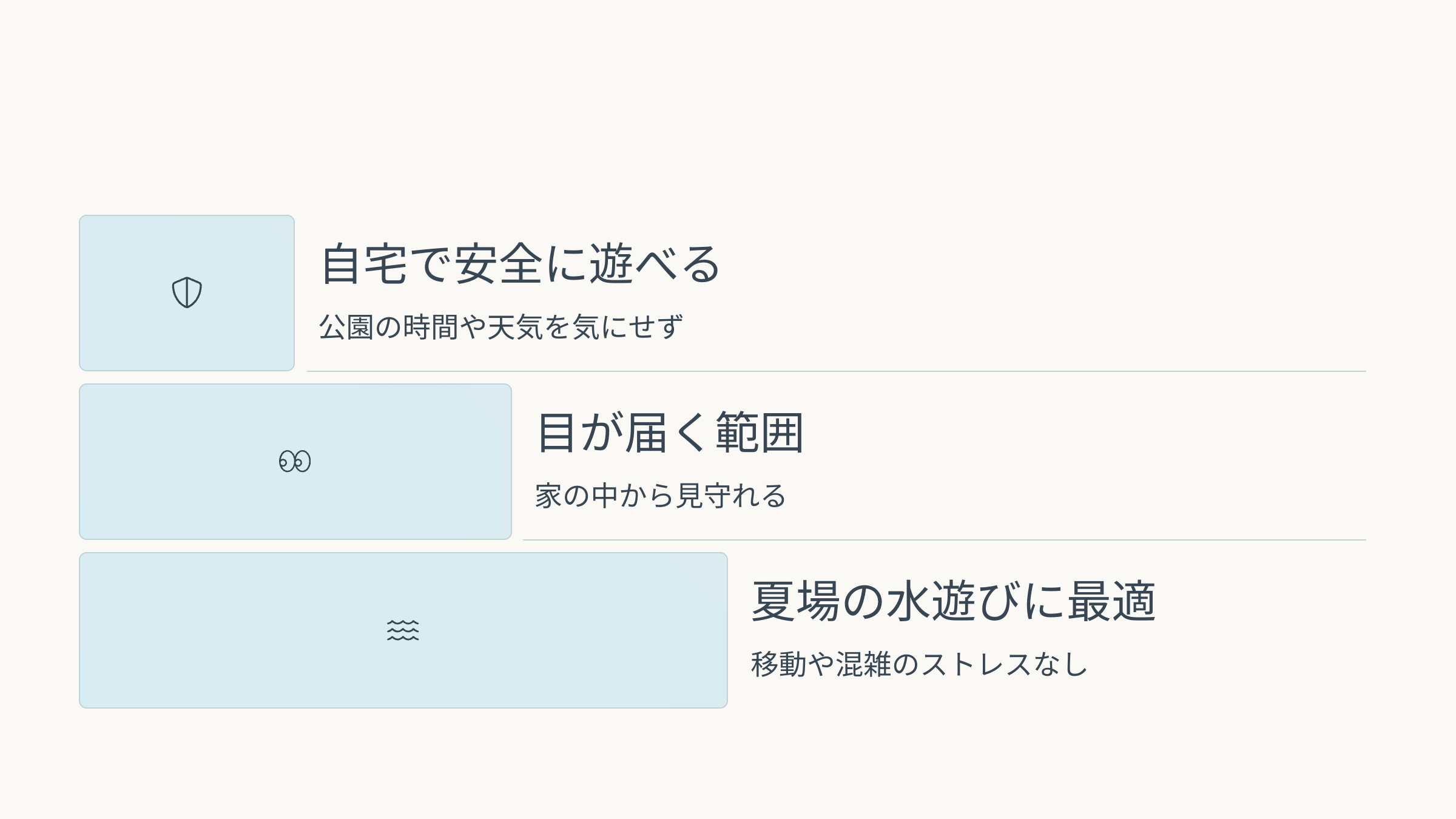 また、プールであれば夏場の水遊びに最適。わざわざ市民プールやレジャー施設に出かける必要がなくなり、移動や混雑のストレスからも解放されます。