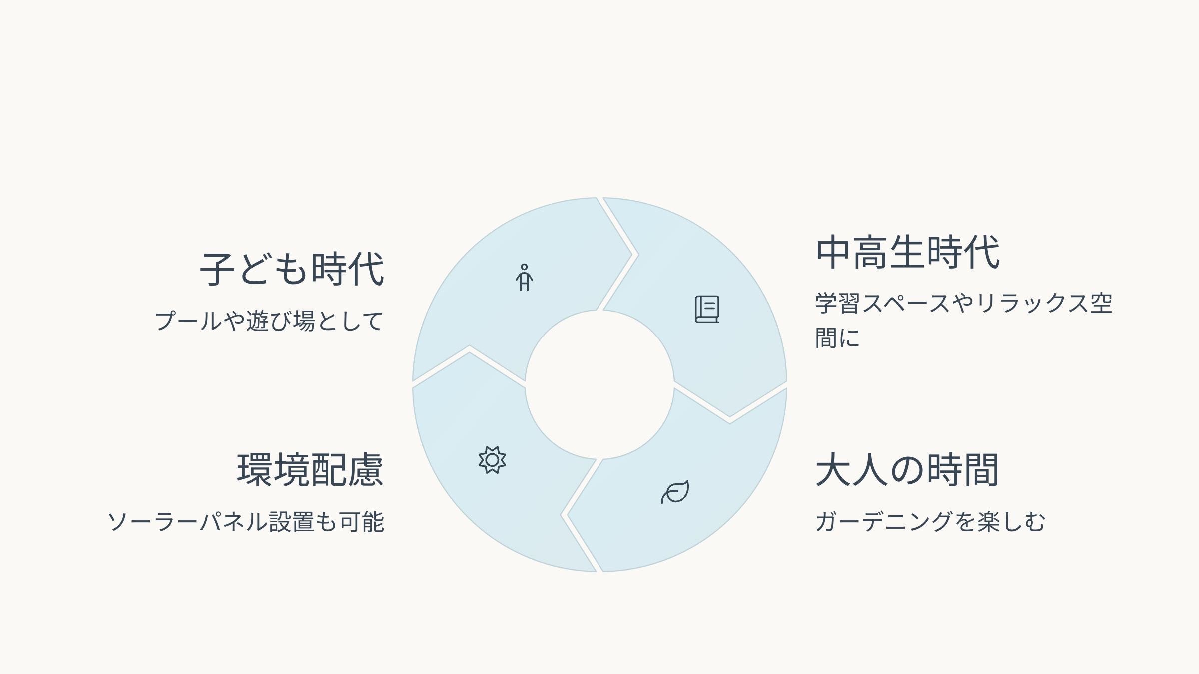 子どもが小さいうちはプールや遊び場として、中高生になれば学習スペースやリラックススペースに。ペットの有無や家族構成が変わっても、屋上という“フリースペース”があれば柔軟に対応できます。