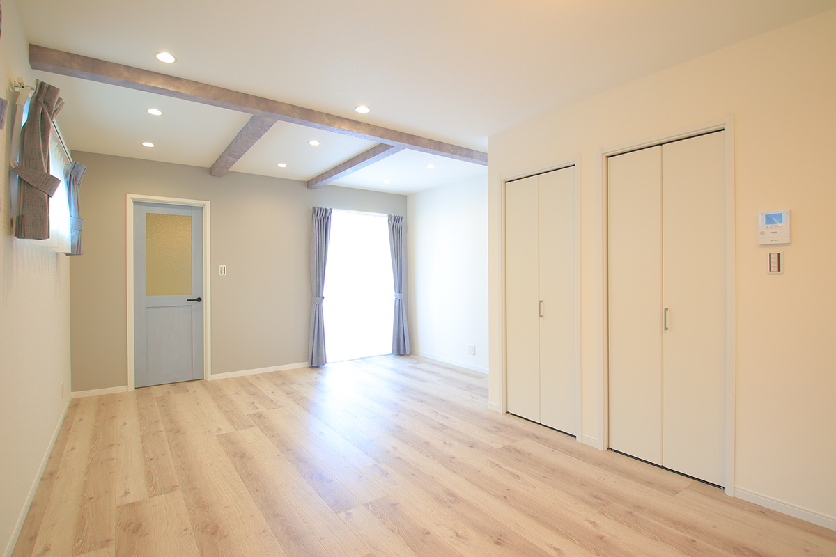 キッチン裏に2畳のパントリーを設置。食品や日用品をまとめ買いしてもスッキリ収納可能。急な来客時にも生活感を隠せるため、常に「片付いて見える空間」をキープできます。冷蔵庫もパントリー側に配置することで生活感を最小限に抑えたデザイン性の高いLDKに。
