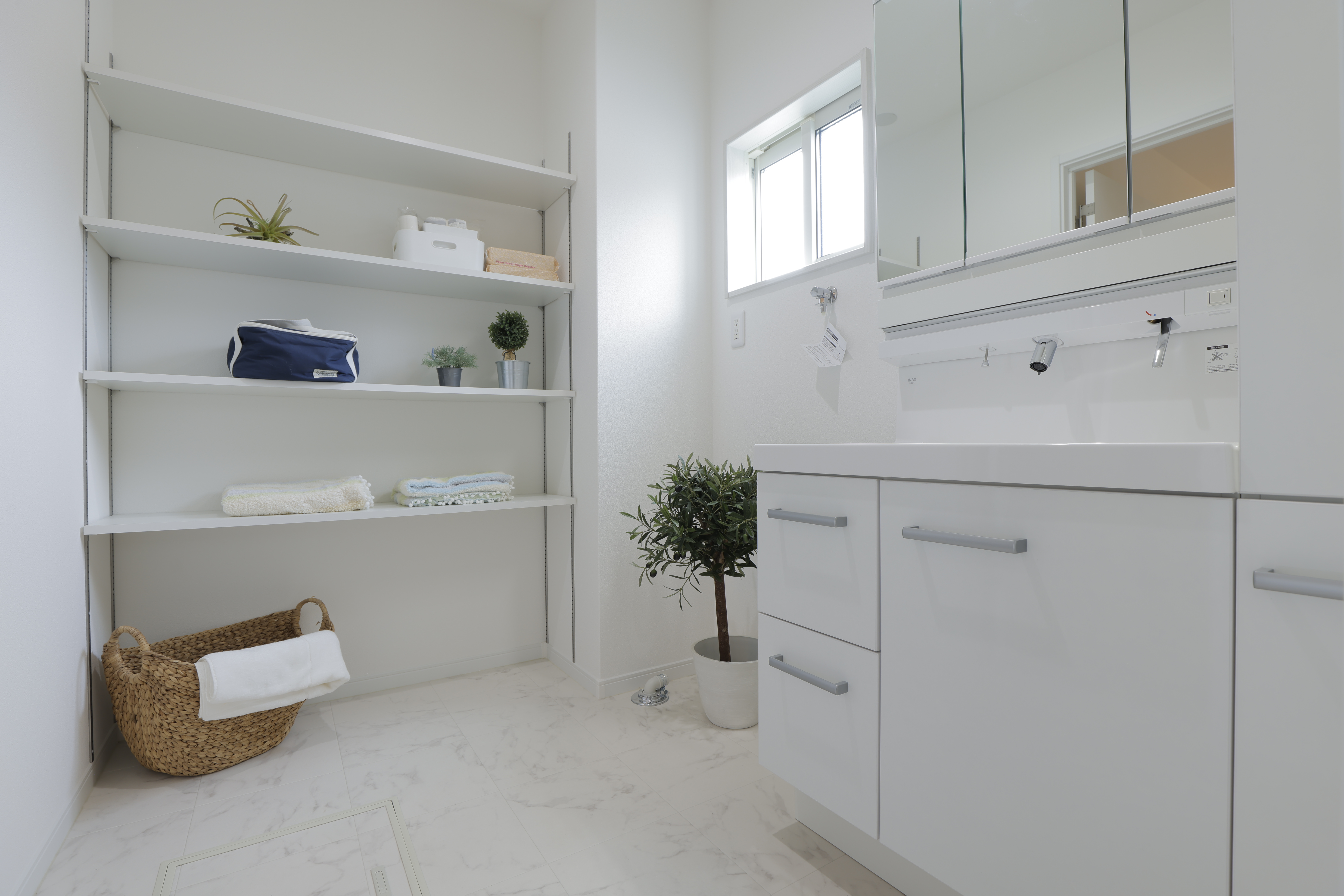 玄関横には大容量の土間収納。コートやバッグ、仕事用カバンもすべてここに集約することで、朝の支度が時短に。さらに、玄関→洗面→LDKへと回遊できる動線を採用しており、身支度・洗濯・調理の動線がぶつからないストレスフリーな朝を演出します。