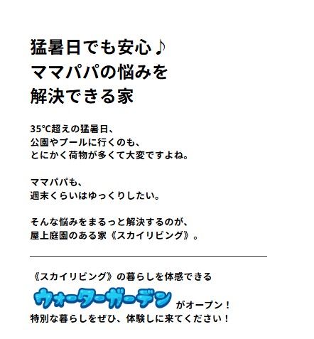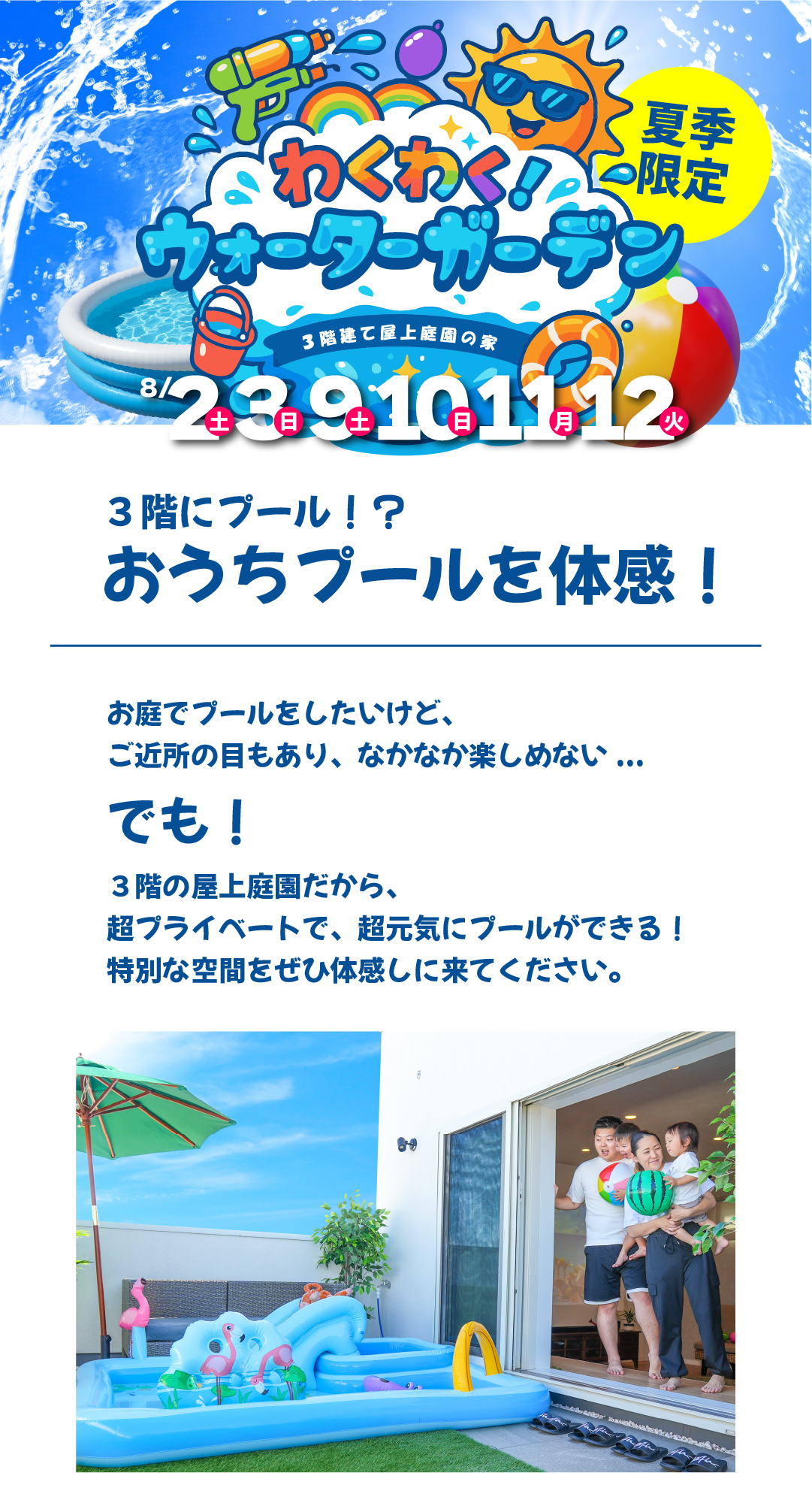 見学会 『わくわく!ウォーターガーデン』夏休みの水遊びは毎日自宅でOK! 開催期間 毎週開催(火・水を除く) 10:00〜18:00 完全予約制 開催場所 ナカオホーム本社横モデルハウス 『SKYLIVING PARK』 安城市安城町社口堂75 このイベントを予約する