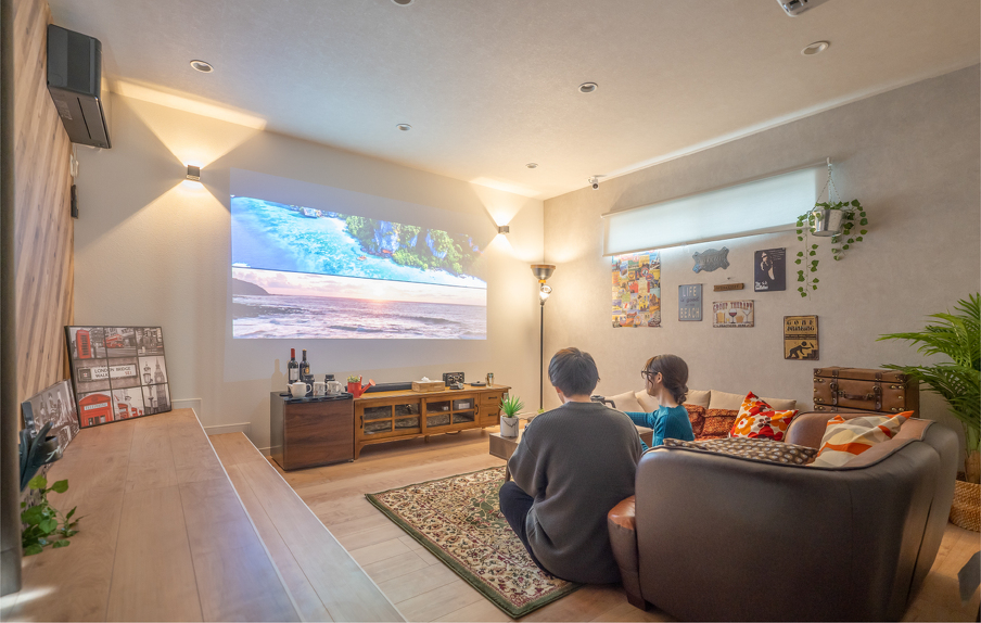 屋上庭園と繋がるスイートルームでは、大迫力の映画を楽しめる。